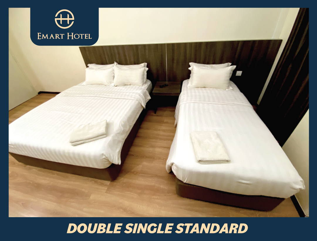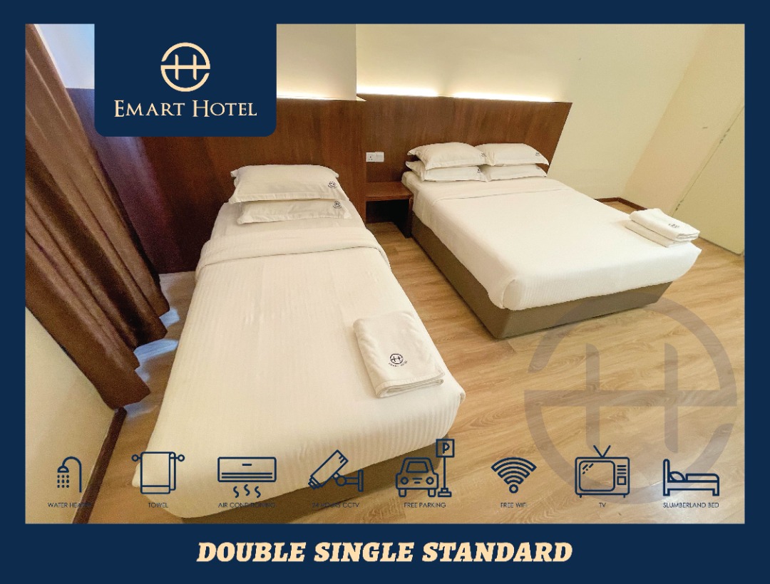 Share a cozy and affordable room with your friend or family member in the Double Single Standard Room at Emart Hotel. This room offers a practical and convenient accommodation for two people. It features two single beds, a private bathroom with a shower and free toiletries, a 32-inch LCD TV with satellite channels, an electric kettle, and free WiFi. The room is also air-conditioned and has daily housekeeping service. You can also access the 24-hour front desk and the free parking available at the hotel.