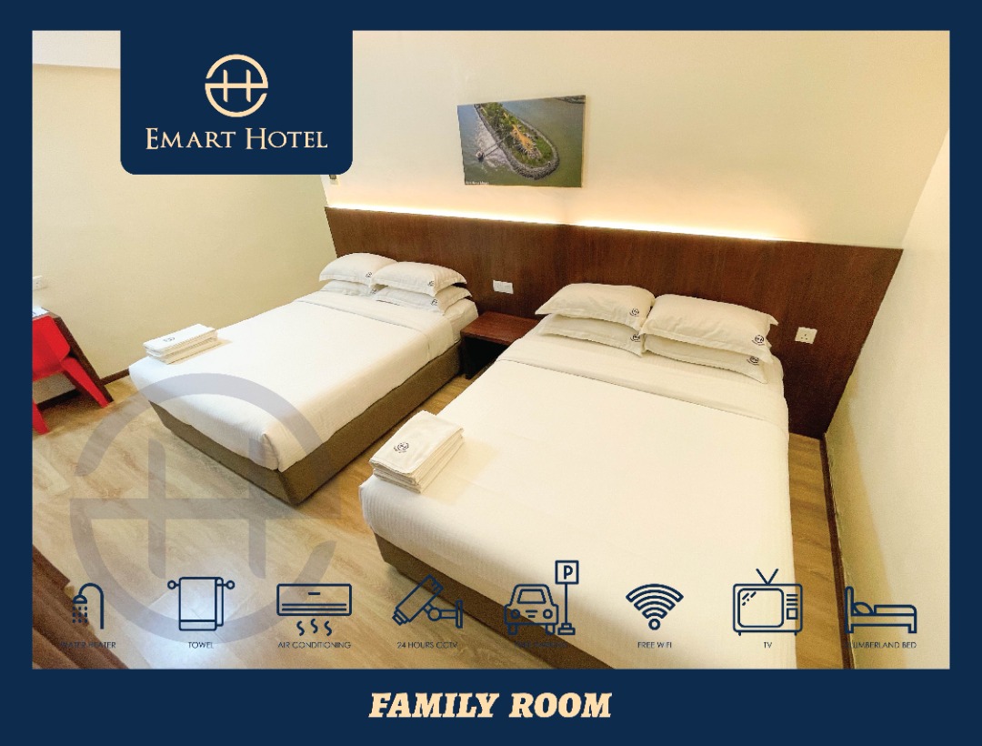 Have a fun and memorable stay with your loved ones in the Family Room at Emart Hotel. This room offers a spacious and versatile accommodation for up to four people. It features two double beds, a private bathroom with a shower and free toiletries, a 32-inch LCD TV with satellite channels, an electric kettle, and free WiFi. The room is also air-conditioned and has daily housekeeping service. You can also access the 24-hour front desk and the free parking available at the hotel.